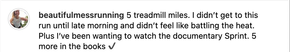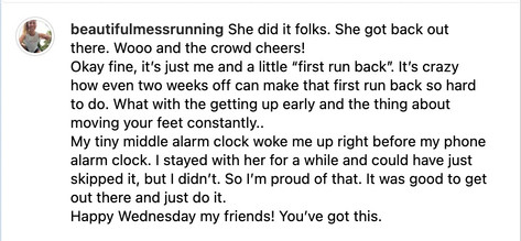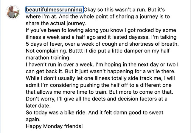 For those of you just joining the journey, I was pretty sick and had to take over a week off. It feels good to be back in the swing of things. As hard as it is to "restart" every time, I always love the solid sweat that follows and how strong I feel after returning to running/lifting. I knew I had to just do it and I would eventually get back into the groove.